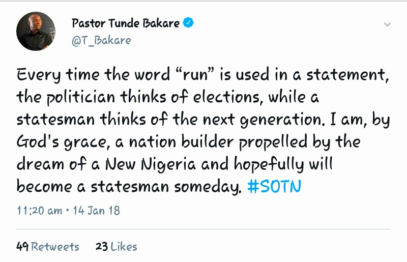 According to his tweets, at no point did he say he would run in 2019 or declared open a presidential campaign as was inferred in the reports of his Monday, January 1, 2018 sermon.